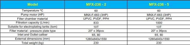 Kartrid Seri MFX terbuat dari polipropilena (PP) dan polivinilidena flourida (PVDF) berkualitas tinggi, dengan berbagai pilihan bahan tambahan yang tersedia. Tangki dirancang dengan cetakan terintegrasi tanpa titik las, memastikan struktur yang 100% bebas bocor, tahan lama dan aman dengan masa pakai hingga 10 tahun. Sistem ini memiliki kapasistas filtrasi maksimum hingga 60 m3/h dan banyak digunakan untuk penyaringan larutan asam-basa, cairan pelapisan Listrik, serta larutan pembersih. Tersedia dalam dua konfigurasi kartrid – 28 and 36 filter untuk memenuhi berbagai kebutuhan aplikasi.