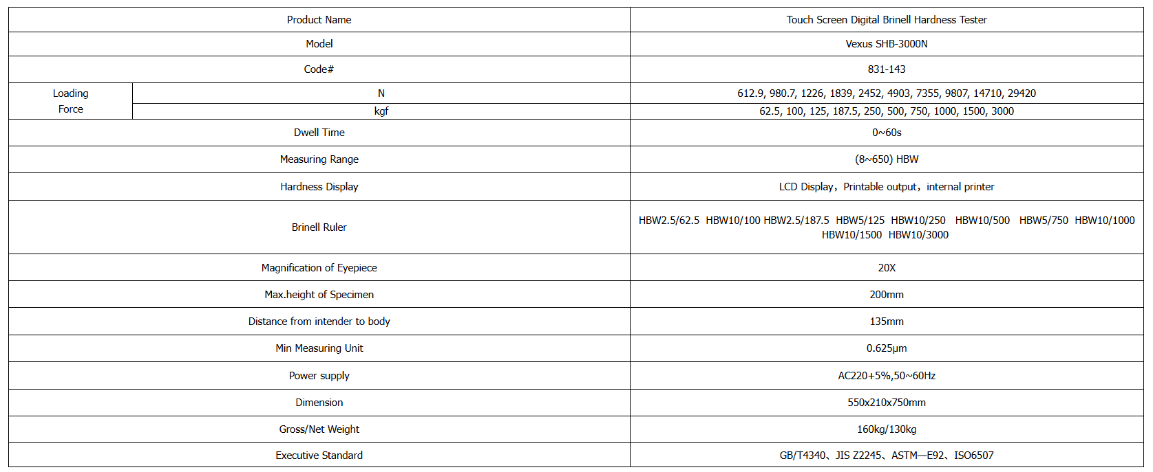 Vexus SHB-3000D adalah mesin uji kekerasan Brinell digital modern yang dilengkapi antarmuka layar sentuh berwarna penuh, sistem pembebanan closed-loop, dan alur pengukuran otomatis. Dirancang untuk lingkungan laboratorium dan produksi yang membutuhkan fungsionalitas tingkat lanjut, alat ini mendukung berbagai rentang gaya dan memberikan hasil yang cepat serta akurat.
