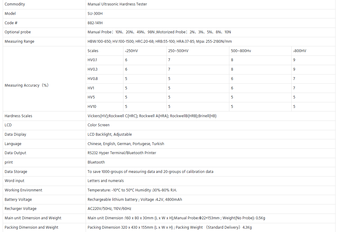 pengukuran kekerasan secara non-destruktif. Alat ini ideal untuk inspeksi titik (spot-checking) Sinowon SU-300H adalah alat uji kekerasan ultrasonik manual yang tangguh dan portabel, menggunakan teknologi UCI (Ultrasonic Contact Impedance) untuk melakukan pada komponen jadi, benda tempa kecil, sambungan las, cetakan, serta komponen lain yang tidak cocok diuji menggunakan indenter konvensional.
