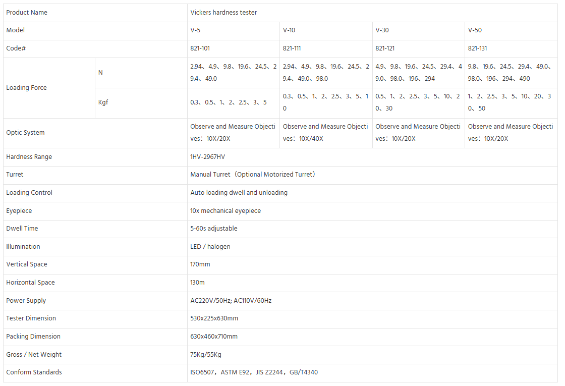 V Series Vickers Hardness Tester adalah instrumen pengujian kekerasan Vickers yang andal dan berpresisi tinggi, dirancang untuk berbagai aplikasi pengujian logam dan penelitian ilmiah. Dengan rangka mekanis yang kokoh dan kontrol pembebanan cerdas, alat ini memberikan pembacaan kekerasan yang akurat dari material lunak hingga sangat keras, menjadikannya perangkat serbaguna untuk penjaminan mutu, karakterisasi material, dan analisis metalurgi.
