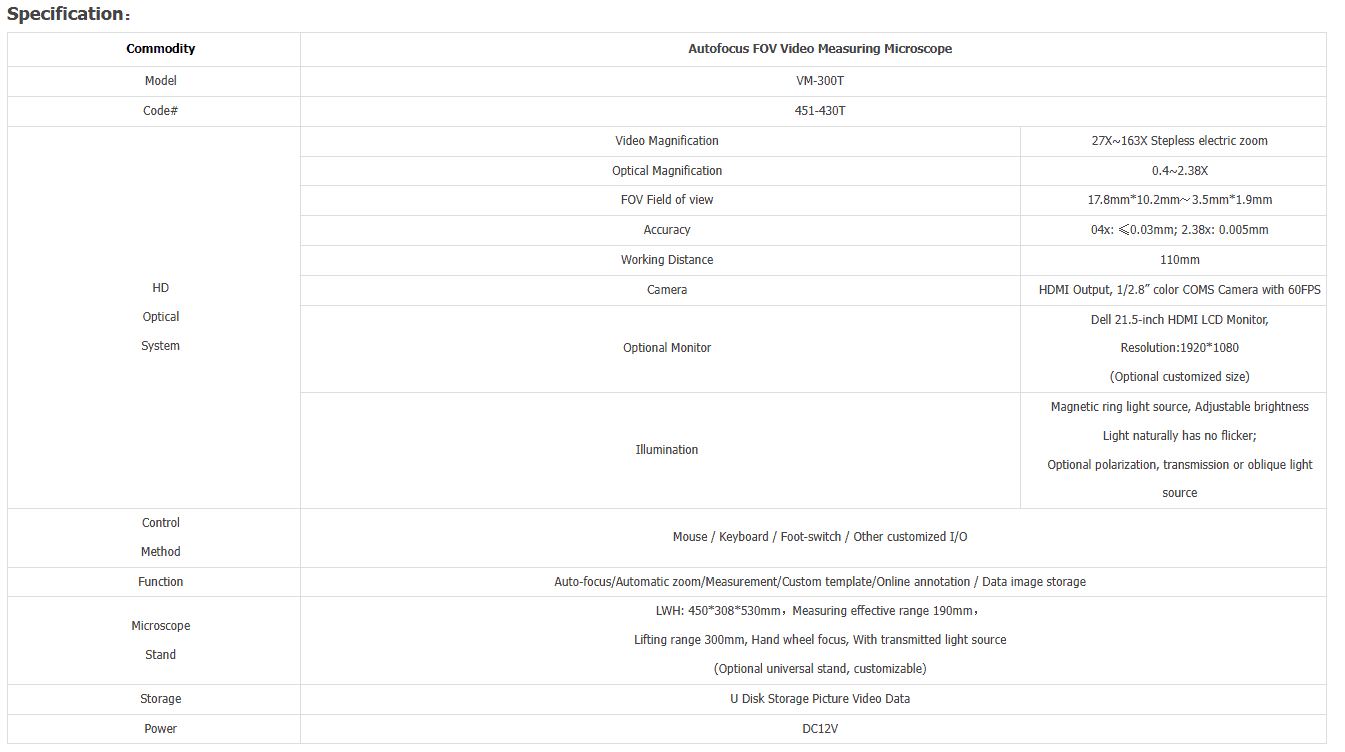 Sinowon VM-300T adalah mikroskop pengukur video dengan fokus otomatis (autofocus) berteknologi tinggi yang dirancang untuk tugas inspeksi dan pengukuran presisi. Mikroskop ini dilengkapi dengan sistem optik dengan bidang pandang luas (Field of View/FOV), zoom bermotor, kemampuan fokus otomatis, serta perangkat lunak pengukuran yang canggih — menjadikannya ideal untuk inspeksi material masuk, pemantauan produksi, penelitian material, inspeksi PCB/SMT, percetakan, tekstil, dan berbagai aplikasi industri lainnya.